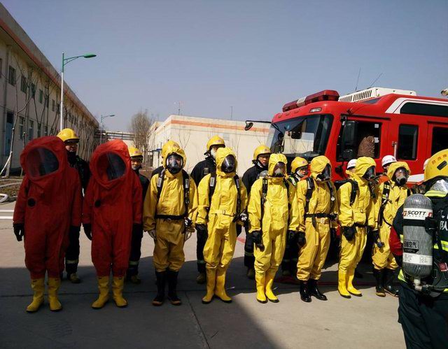 洛陽市消防支隊王榮范參謀長、西工區(qū)消防大隊劉學(xué)康大隊長及洛陽正大總裁辦喬光斌總經(jīng)理、食品事業(yè)部杜光輝副總經(jīng)理一行在演練前到達(dá)演練場地進(jìn)行安排部署,成立了消防演練現(xiàn)場指揮部,由洛陽市消防支隊王榮范參謀長任指揮長。演練假設(shè)正大食品有限公司制冷機(jī)房因設(shè)備發(fā)生故障,液氨罐發(fā)生泄漏,1名操作人員受困,現(xiàn)場人員立即向公司領(lǐng)導(dǎo)匯報并撥打119尋求支援。119指揮中心在接到報警后,由洛陽市消防支隊協(xié)調(diào),迅速調(diào)集澗西消防大隊下屬谷水中隊,西工區(qū)消防大隊下屬車站中隊、紅山中隊迅速趕赴現(xiàn)場,與此同時正大食品有限公司迅速啟動單位應(yīng)急預(yù)案,組織員工疏散。十五分鐘后,紅山消防中隊6臺消防車、2臺救護(hù)車到達(dá)現(xiàn)場,消防戰(zhàn)士著防化服立即進(jìn)入現(xiàn)場,對氨中毒人員進(jìn)行搶救,對氨泄漏部位進(jìn)行應(yīng)急處置。二十分鐘后谷水中隊、車站中隊6臺消防車達(dá)到現(xiàn)場支援, 50余名消防員展開救援戰(zhàn)斗,用消防水槍噴水中和泄漏的氨氣,降低空氣中氨的濃度。經(jīng)過近一個小時的搶維修,氨泄漏得到控制,演練指揮中心宣布本次演練***結(jié)束。